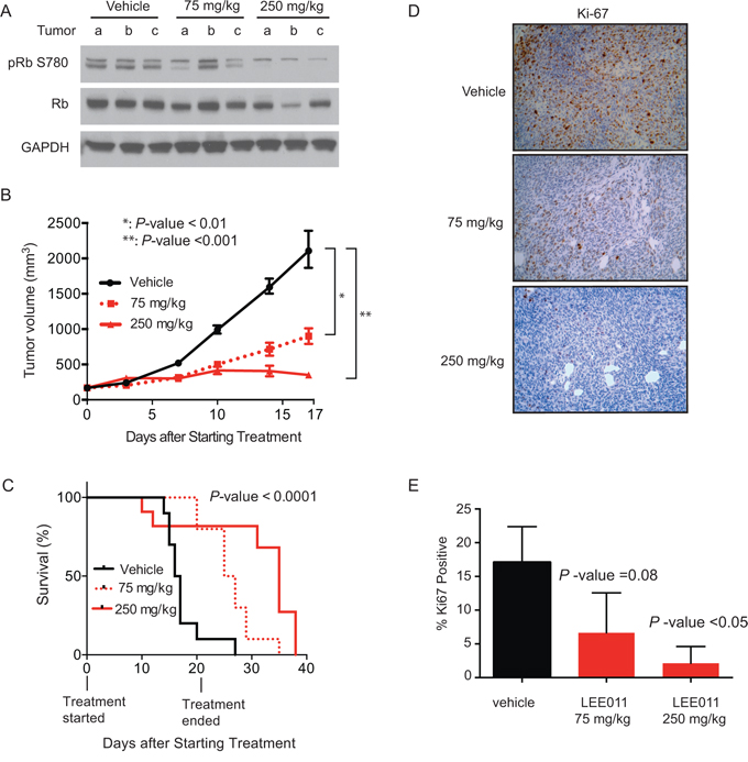 Figure 7: LEE011 impairs Ewing sarcoma tumor xenograft growth in vivo. A. Western blot showing LEE011 effects on the downstream target of CDK4, Rb phosphoserine 780, total Rb or GAPDH in tumor cell lysates. B. Tumor volume over time in animals treated with vehicle, LEE011 at 75 mg/kg or 250 mg/kg. C. Kaplan-Meier survival curve of control, 75 mg/kg or 250 mg/kg daily dosing of LEE011. Log-rank (Mantel-Cox) test (P-value < 0.0001) and Logrank test for trend (P-value < 0.0001) were used to calculate P-value comparing the three survival curves. D. Immunohistochemical staining for proliferation marker Ki-67. E. Quantification of Ki-67 staining compared to vehicle.