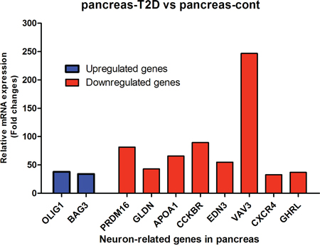 Table 1: The list of highly up-regulated and down-regulated genes with a neuronal function detected in human control pancreas and pancreas with type 2 diabetes (T2D) using mRNA expression.