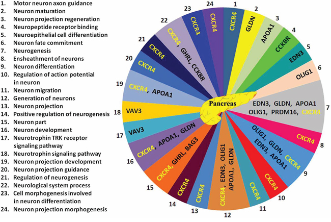 Figure 2: 24 neuronal functions related to the 10 genes found in pancreas based on Gene Ontology database search. Neuronal processes related to the 10 genes are numbered from 1 to 24 (left side of Figure) and corresponded with numbers 1 to 24 shown in pancreas Figure. Abbreviations are in Tables 1 and 2.