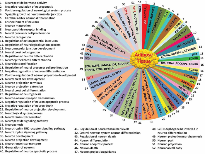 The expression of 15 genes were found to be highly altered in AT caused by age-induced T2D (Table 2 and Figure 3). From these 15 genes, 8 gens were highly up-regulated and 7 genes highly down-regulated (Table 2, and Figure 3). The expression of synaptotagmin-4 (SYT4) gene were tremendously high up-regulated (approximately 392-fold) in AT-T2D as compared to AT-control, while VGF (neurosecretory protein) is highly down-regulated (approximately 119-fold) Table 2 and Figure 3). Another gene, which is very highly up-regulated in AT-T2D as compared to AT-control was MYRF (Myelin regulatory factor) as displayed in Table 2 and Figure 3. The fold changes of all 15 genes were reported in Table 2. Based on Gene Ontology database search, 52 neural functions were found for these 15 genes (Figure 4). Although VGF gene was highly down-regulated, only one neural function (i.e. neuropeptide hormone activity) was shown to be linked with this gene (Figure 4). SYT4 gene showed a link with 5 neural functions; 1- neurological system process, 2- neurotransmitter secretion, 3- neurotransmitter transport 4- neuron part and 5- neuron projection. Based on Gene Ontology search, PTN and LRNN4 genes showed only link with one neural function (Figure 4) and both genes were up-regulated, while the other genes showed multiple neural functions.
