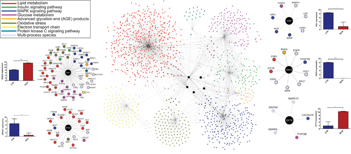 The majority of investigations and drug developments for DNs conducted so far focused on glucose metabolic pathways. Neuropathies still remains a great problem in patients with diabetes. The expression of APOA1 in control pancreas and severe down-regulation in pancreas with T2D is very novel and important finding, which open new avenues on lipid metabolism, HDL, cardiovascular events, diabetes and its complications such as neuropathies, and will help to design new future studies. GHRL and VAV3 are also expressed in pancreas and subjected to extreme level changes in pancreas-T2D. SYT4 and VGF were synthesized in AT and the levels alter in AT-T2D dramatically. Based on this study, we conclude that not only diabetes but also its complications such as DNs are multifactorial diseases. Also, this study provides us a list of most important genes affected by diabetes involved in neuronal processes, which opens new avenues for new investigations for drug development (using agonists or antagonists) and new pathway(s) for the treatment of DNs.