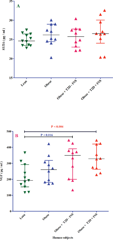 Of note, the gene-expression data do not have enough power without the confirmation of gene product (i.e. protein). For this reason, five from 25 genes was selected to measure their protein levels. SYT4 and VGF proteins were chosen from AT-associated 15 genes, because SYT4 gene was highest and VGF lowest expressed in AT-T2D respectively. Although plasma VGF protein concentration in three groups of patients did not correspond with VGF gene expression, both plasma SYT4 and VGF protein concentrations were increased and decreased in obese-T2D with insulin injection as compared to without insulin injection in human subjects respectively. The effect of insulin was also observed for BAG3, APOA1 and VAV3 in obese-T2D with and without insulin injection in human subjects. Based on these data, it is then logic to assume that insulin has an effect on the concentrations of these five proteins and this role of insulin could be considered as so-called “corrector”. Importantly, VGF gene expression did not correspond to VGF protein levels and one reason could be that post translational modifications (PTMs) determine VGF protein levels and not transcriptional phase. Although we did not observe any significant differences between three patient groups and lean subjects with respect to SYT4, BAG3, APOA1, and VAV3, except for VGF protein, there was a trend between the expression of these four genes and their protein levels.