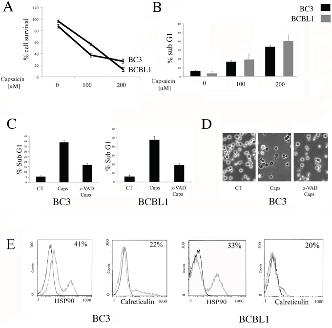 Figure 1: Capsaicin induces an immunogenic apoptosis in PEL cells. A. Capsaicin-induced loss of viability in PEL cell lines is dose-dependent. BC3 and BCBL1 were treated for 24 hours with different Capaicin concentrations (100 and 200 μM). Cells were counted by trypan blue exclusion and mean of the percentage of cell survival plus SD of three independent experiments is indicated; B. BC3 and BCBL1 cells were treated with Capsaicin (100 and 200 μM) and the effect of the drugs on nuclear fragmentation was also evaluated (Sub-G1 phase), representing the apoptotic cells. Mean of the percentage of sub-G1 cells plus SD of three independent experiments is indicated; C. The reduction of the percentage of the Sub-G1 cells obtained with Z-VAD-fmk (z-VAD) pre-treatment at 50 μM is also shown. Mean of the percentage of positive cells plus SD of three independent experiments is indicated; D. The reduction of the BC3 cell death obtained with Z-VAD-fmk (z-VAD) pre-treatment, at 50 μM, is evidenced by optical microscopic observation; E. Induction of HSP90 and CRT translocation on BC3 and BCBL1 cell surface induced by Capsaicin after 12 hours of treatment is shown. Percentage of positive cells of a representative experiment is shown.