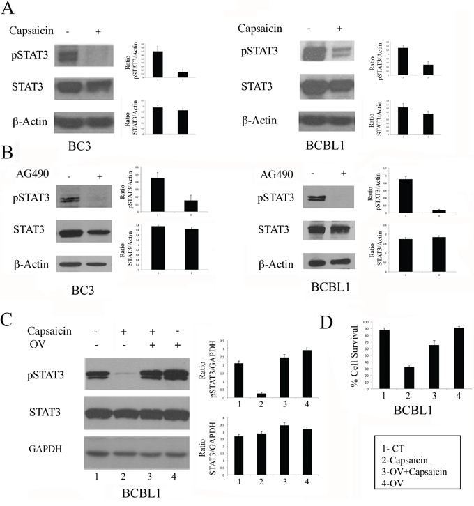 Figure 2: The reduction of STAT3 phosphorylation is involved in Capsaicin-mediated cell death. A. BC3 and BCBL1 were treated for 24 hours with Capaicin (200 μM) and STAT3 tyrosine phosphorylation was evaluated by western blot analysis. Total STAT3 and β-Actin were included as control. A representative experiment is shown and the mean plus SD of the densitometric analysis of the specific proteins on β-Actin of three independent experiments is also reported; B. BC3 and BCBL1 were treated for 24 hours with AG490 (100 μM) and STAT3 tyrosine phosphorylation was evaluated by western blot analysis. Total STAT3 and Actin were included as control. A representative experiment is shown and the mean plus SD of the densitometric analysis of the specific proteins on β-Actin of three independent experiments is also reported; C. BCBL1 PEL cells were treated for 24 hours with Capsaicin (200 μM) in the presence or in the absence of orthovanadate (OV) (100 μM) and STAT3 tyrosine phosphorylation was evaluated by western blot analysis. Total STAT3 and GAPDH were included as control. Mean plus SD of the densitometric analysis of the specific proteins on GAPDH of three independent experiments is also reported; D. Cell viability of BCBL1 PEL cells treated for 24 hours with Capaicin (200 μM) in the presence or in the absence of OV (100 μM). Cells were counted by trypan blue exclusion and mean of the percentage of cell survival plus SD of three independent experiments is shown.