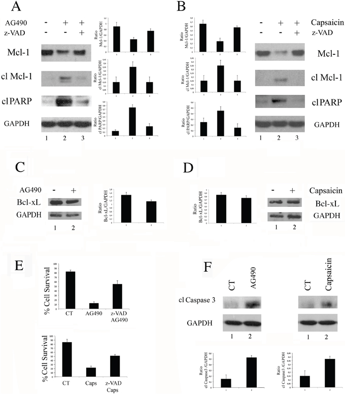 To further demonstrate that Capsaicin mediated cell death correlated with STAT3 de-phosphorylation, we compared its effect with the effect mediated by AG490 STAT3 inhibitor. Since STAT3 inhibition has been previously reported to reduce the expression of the anti-apoptotic molecule Mcl-1, [28] its expression level was evaluated in BC3 PEL cells treated with Capsaicin or AG490. We found that both treatments, besides reducing the expression level of Mcl-1, induced the appearance of its cleaved pro-apoptotic fragment [29] (Figure 3A and 3B). Concomitantly, an increase of the PARP-cleavage (Figure 3A and 3B) was observed in BC3 cells treated with Capsaicin as well as with AG490. We then investigated if, besides Mcl-1, another member belonging to the same family, such as Bcl-xL, would be affected by Capsaicin and/or AG490 and found that it was slightly reduced by both treatments (Figure 3C and 3D). These results indicate that the reduction of Mcl-1 was a rather specific effect correlated with STAT3 de-phosphorylation. Finally, we found that the reduction of cell survival mediated by Capsaicin as well as by AG490 was reverted by z-VAD-fmk pan-caspase inhibitor (Figure 3E), according to the caspase3 activation by both treatments (Figure 3F).