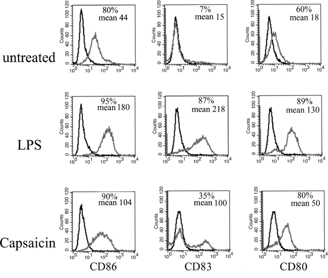 Figure 5: Capsaicin activates DCs. DCs were treated with Capsaicin (150 μM) or LPS (100 ng/ml) for 24 hrs and CD86, CD83 and CD80 expression was evaluated by Flow cytometry analysis. Mean fluorescence intensity and the percentage of positive cells is also reported.