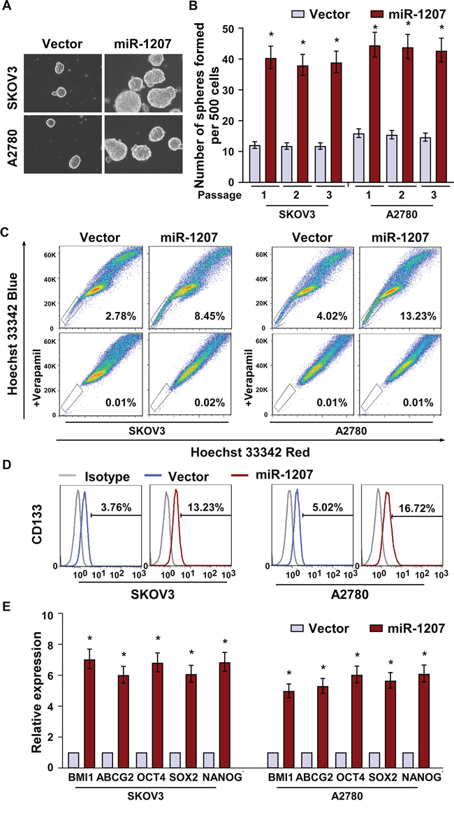 Figure 2: MiR-1207 overexpression promotes cancer stem–like traits in ovarian cancer. A–B. Representative micrographs (A) and quantification (B) of tumor sphere formation in miR-1207 overexpression or vector cells. Scale bar, 100 μm. C–D. Hoechst 33342 dye exclusion assay showing the effect of miR-1207 overexpression cells or vector cells on the distribution of SP+ (C) and CD133+ cells (D) determined using flow cytometric analysis. E. Real-time PCR analysis of mRNA expression of pluripotency-associated markers in the cells. Transcript levels were normalized to GAPDH expression. Error bars represent the mean ± SD of three independent experiments. *P < 0.05.