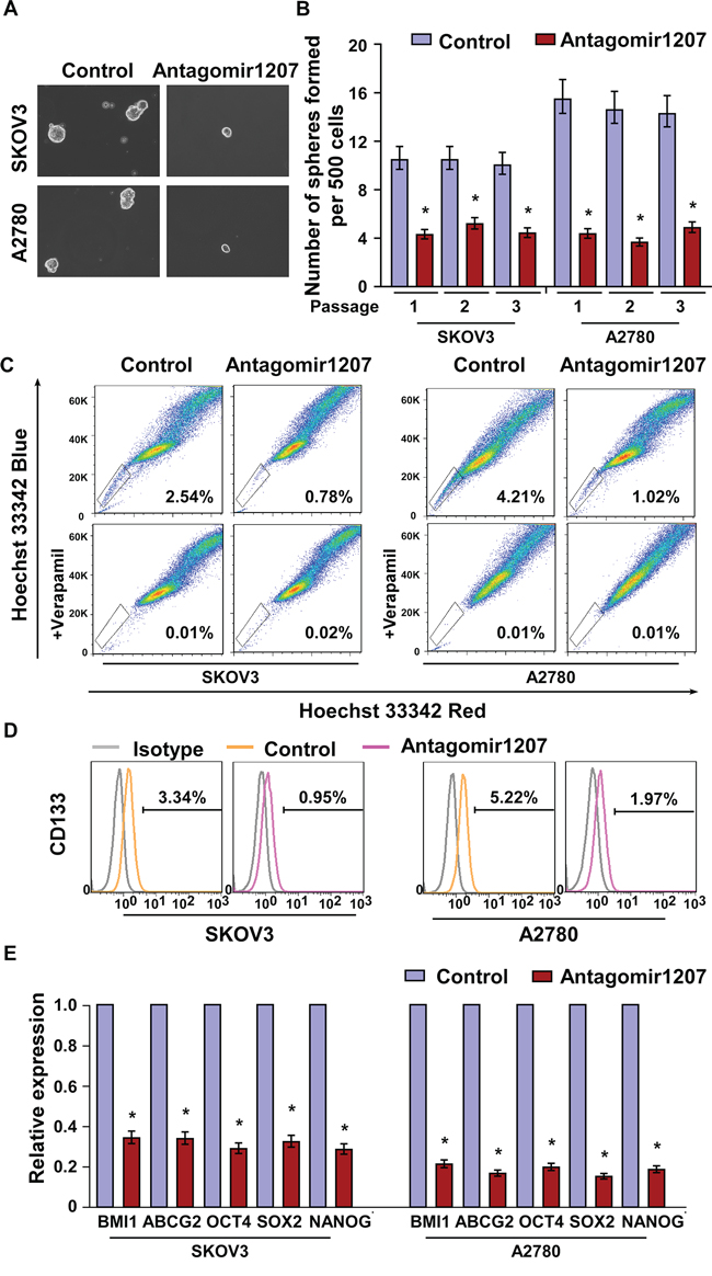 Figure 3: MiR-1207 inhibition reduces stem cell–like traits in ovarian cancer. A–B. Representative micrographs (A) and quantification (B) of tumor sphere formation in antagomir-1207 or control cells. Scale bar, 100 μm. C–D. Effects of antagomir-1207 or control cells on the distribution of (C) SP+ and (D) CD133+ cells determined using flow cytometric analysis. E. Real-time PCR of the mRNA expression of pluripotency-associated markers in antagomir-1207 or control cells. Transcript levels were normalized to GAPDH expression. Error bars represent the mean ± SD of three independent experiments. *P < 0.05.