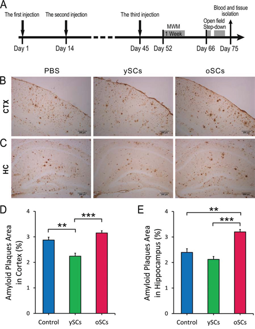 Morris Water Maze tests indicate that ySCs are more beneficial for the improvement of cognitive function in AD mice. This was also supported by other studies [24, 25, 36–38]. Although ySCs treatment could not significantly improve spatial learning and memory compared with PBS control, there was an obvious decrease in cognitive impairments in the old AD mice compared with the oSCs treatment. This corresponds to the results that ySCs treatment did not reduce amyloid burden in the hippocampus, an area responsible for spatial learning and memory.
