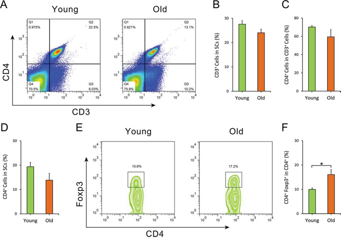 Figure 5: Flow cytometry analysis of splenocytes. The frequency of CD3+ T cells, CD4+ T cells and CD4+ Foxp3+ Treg cells of splenocytes from both old APPswe/PSENldE9 transgenic mice (old, 14–15 month-old) and young mice (young, 6–8 week-old) were analyzed by flow cytometry. A. Dot plots of CD3+ T cells, CD4+ T cells in splenocytes. B. Statistical analysis for the percentage of CD3+ T cells in splenocytes. C. The percentage of CD4+ T cells in CD3+ T cells of SCs isolated from old AD mice and young WT mice. D. The percentage of CD3+ CD4+ T cells in splenocytes. E. Representative flow cytometry of CD4+ Foxp3+ Treg cells within CD4+ T lymphocytes. F. Statistical analysis for the frequency of CD4+ Foxp3+ Treg cells in CD4+ T cells. Data are presented as mean ± SEM, n = 6. *p < 0.05, Student’s t-test.