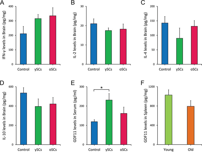 Figure 6: The ySCs treatment increased GDF11 levels in blood of APPswe/PSENldE9 transgenic mice. A-D. After SCs treatment, the levels of IFN-γ, IL-2, IL-4, IL-10 in brain of APPswe/PSENldE9 transgenic mice were assayed by ELISA. The content of the cytokines per mg brain tissue was calculated for statistical analysis. One way ANOVA with LSD post-hoc test was used for statistical analysis (n = 6). E. The serum GDF11 level of APPswe/PSENldE9 transgenic mice with SCs treatments was assayed by ELISA. One way ANOVA with LSD post-hoc test was used for statistical analysis (n = 6). F. The GDF11 expression of spleen isolated from old APPswe/PSENldE9 transgenic mice (14–15 month-old) and young mice (young, 6–8 week-old) mice was compared. Spleen homogenates were used for assaying the GDF11 expression in spleen by ELISA (Student’s t-test for statistical analysis). Data are presented as mean ± SEM, n = 5, *p < 0.05.