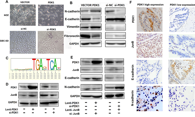 In this study, we investigated the role of PDK1 in GBC, by evaluating changes in GBC cell morphology after both increasing and decreasing PDK1 expression via plasmid transfection and siRNA administration, respectively. We also examined the effect of PDK1 levels on JunB expression and on markers of EMT.