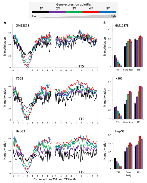 We further evaluated this paradoxical relationship using DNA methylation and gene expression data from ENCODE cell-lines (Table 1). To do this, percent DNA methylation values in-and-around gene-bodies were compared across five gene expression level quintiles. Consistent with previous reports in human cell-lines [11, 13], DNA methylation levels around transcription start sites (TSS) at the 5’ ends of genes show a clearly negative and monotonic correlation with gene expression levels (Figure 1 and Supplementary Material, Figure S1). The TSS regions of highly expressed genes are relatively depleted for DNA methylation whereas genes expressed at lower levels are increasingly methylated.