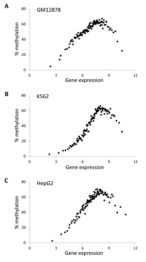 Figure 2: A non-monotonic relationship between gene-body DNA methylation and gene expression. Overall percentage methylation of gene-bodies (regions starting at 1kb downstream of the TSS and ending at 1kb upstream of the TTS of genes) is regressed against gene expression for (A) GM12878 (B) K562 and (C) HepG2. Genes are grouped into 100 gene expression bins.