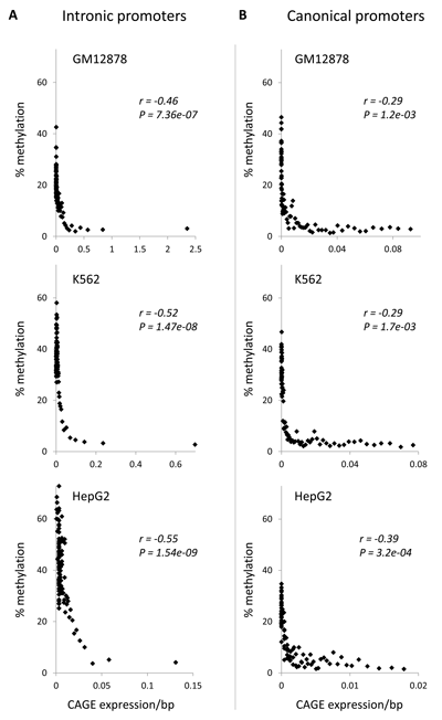 Figure 3: Relationship between DNA methylation and promoter activity levels. Percent DNA methylation levels are regressed against CAGE expression levels (i.e. promoter activity) for (A) intronic and (B) canonical 5’ gene promoters. Genes are grouped into 100 gene expression bins. Pearson correlation coefficient values (r) along with their significance values (P) are shown for each regression.