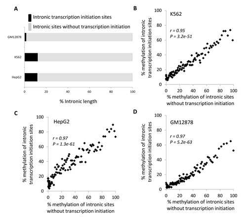 Figure 4: Comparison of length and DNA methylation attributes of intronic promoters and intronic sites without transcription initiation. (A) Percentage of intronic length occupied by transcription initiation sites (black) and versus sites without transcription initiation (grey). Percent DNA methylation levels for transcription initiation sites are regressed against methylation levels for non-transcription initiation sites for (B) GM12878, (C) K562 and (D) HepG2 cell-lines. Genes are grouped into 100 methylation level bins. Pearson correlation coefficient values (r) along with their significance values (P) are shown for each regression.