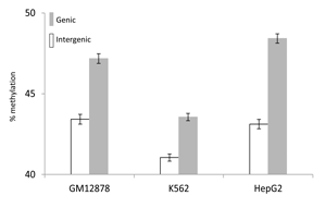 Figure 5: Comparison between genic and intergenic average (± standard error) DNA methylation levels in GM12878, K562 and HepG2 cell-lines.