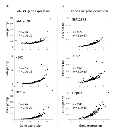 Figure 6: Relationship between chromatin environment and gene expression levels. (A) Pol2 occupancy and (B) density of DHSS sites are regressed against gene expression. Genes are grouped into 100 gene expression bins. Pearson correlation coefficient values (r) along with their significance values (P) are shown for each regression.