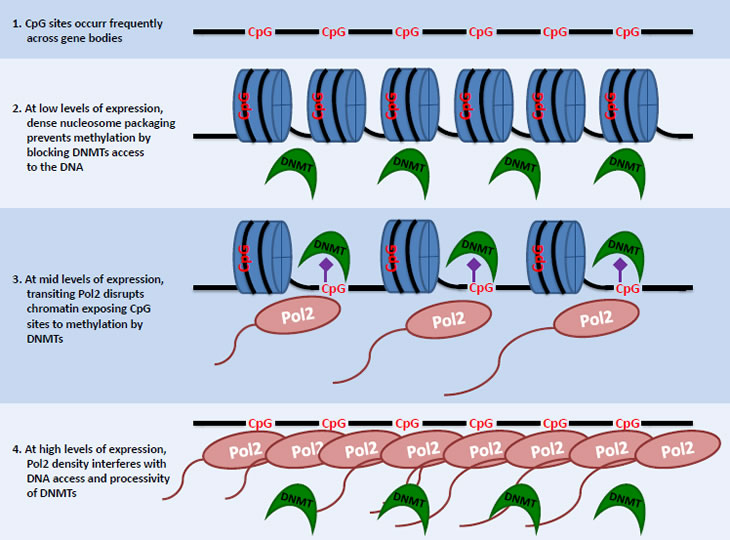 The model explaining levels of gene-body methylation is illustrated in Figure 7 and can be summarized as follows. The extent of nucleosome packaging seen for unexpressed and compact chromatin would not allow for access to the DNA by DNMT1, effectively blocking DNA methylation. At low levels of transcription, transiting Pol2 complexes disrupt nucleosome packaging and open up the chromatin thereby exposing CpG sites for methylation. Therefore, levels of gene-body methylation will increase with increasing levels of expression at the low end of the expression spectrum. However, as genes become increasingly highly expressed, the density of transiting Pol2 becomes so high as to begin to interfere with the processivity of DNMT1 along DNA. This leads to a progressive reduction of gene-body methylation levels with increasing expression levels at the high end of the expression spectrum. Therefore, the most lowly and the most highly expressed genes will have the lowest levels of methylation, whereas genes expressed at intermediate levels will have the highest gene-body methylation, as seen here for humans and elsewhere for other species [22, 23].