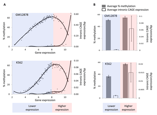 Figure 8: Decreasing levels of gene body methylation, starting from mid-levels of gene expression are correlated with increasing levels of intronic expression. Highly expressed genes are represented by pink background while lowly expressed genes are represented by light blue background. (A) Gene expression levels are regressed against percent gene-body methylation (top curve) and levels of intronic expression (bottom curve). (B) Comparison of average intronic transcription (open bars) and average percentage methylation (grey bars) between lowly and highly expressed genes.