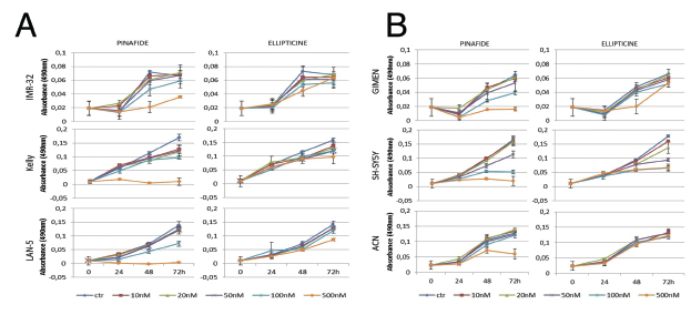 Figure 3: MTS proliferation assay in neuroblastoma cell lines exposed to ellipticine and pinafide. Proliferation of MYCN amplified (panel A) or MYCN non amplified (panel B) cells in the presence of increasing concentrations of Ellipticine and Pinafide, as indicated. Note that cell viability is only reduced by high concentrations (250-500nM) of pinafide, in a MYCN-independent manner. Neuroblastoma cell lines were generally resistant to the killing effect of ellipticine. Error bars indicate standard deviations.