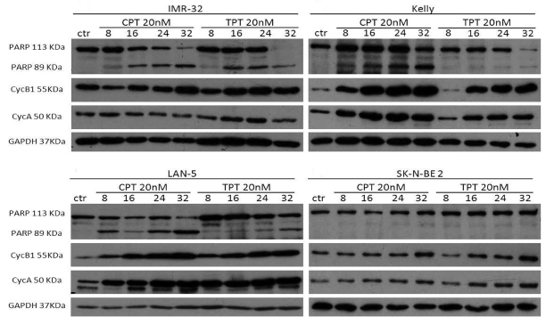 Figure 6: Effects of camptothecin (CPT) and topotecan (TPT) on cell cycle proteins and PARP cleavage. Western blot analysis showing the expression of Cyclin A and cyclin B in the indicated neuroblastoma cell lines treated with CPT or TPT (20nM) for 8-16-24-32hrs. Cleavage of PARP is indicated by the appearance of a 89KDa fragment. The housekeeping gene GAPDH was used as loading control.