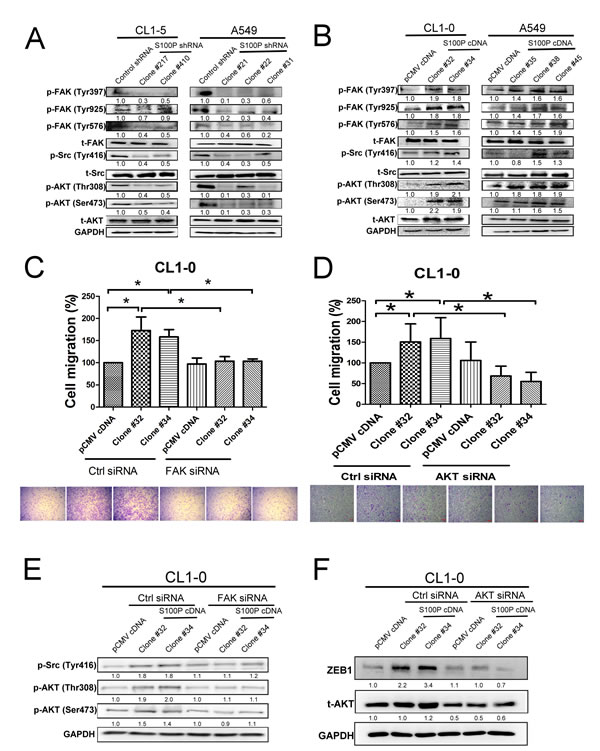 Figure 5: FAK/Src/AKT signaling is involved in S100P-mediated cancer. A. Inhibition of S100P decreased the activation of FAK, Src, and AKT. B. Ectopic expression of S100P increased the phosphorylation of FAK, Src, and AKT. C. Inhibition of FAK by siRNA transfection prevented S100P-mediated cell migration. D. Knockdown of AKT by siRNA decreased S100P-mediated cell migration. E. Knockdown of FAK by siRNA reduced AKT and Src activation in S100P overexpressing CL1-0 cells. F. Transfection of AKT siRNA decreased ZEB1 upregulation in S100P overexpressing CL1-0 cells. The cells were submitted to migration (transwell assay) and immunoblot. The expressions of various proteins were assessed by immunoblot. Data were shown as the mean±SD. *p < 0.05 or significant difference between control and test groups.