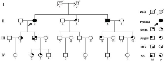 Figure 1: Pedigree of the southern four-generation Chinese family with FMTC and lichen/macular biphasic cutaneous amyloidosis investigated in this study. Circles and squares denote female and male family members, respectively.