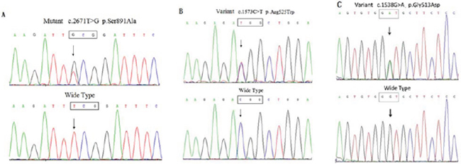 Figure 3: RET and OSMR variants in this pedigree were confirmed by direct sequencing. A. Direct sequencing of PCR products from the proband demonstrated a heterozygous T-to-G substitution at nucleotide position 2671 within exon 15, resulting in a missense mutation designated p.S891A. B. RET p.R525W (c.1573C > T) within exon 8. C. OSMR p.G513D (c.1538G > A) within exon 11 was confirmed.