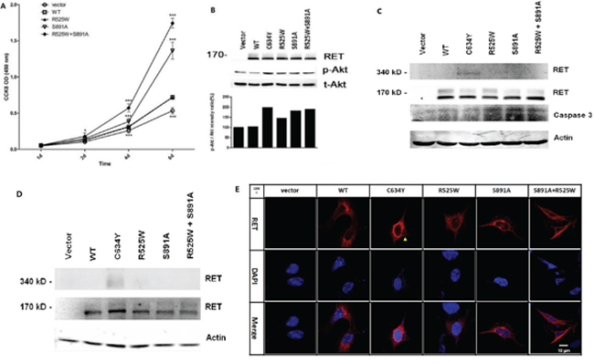 The transforming capacity was assessed in HEK293 and HEK293T cells transfected with wild type-RET, p.R525W, and p.S891A/p.R525W. We found that RET p.S891A/p.R525W and p.S891A had a significant effect on the promotion of cell proliferation rates, and p.S891A/p.R525W showed a stronger effect than p.S891A (Figure 4A). RET p.R525W, p.S891A, p.S891A/p.R525W, and p.C634Y all increased the level of Akt phosphorylation. The phosphorylation level of p.R525W was 20%, 23%, and 30% weaker than that of p.S891A, p.S891A/p.R525W, and p.C634Y, respectively (Figure 4B). To confirm whether the proliferative effect resulted from apoptosis, we detected any alteration in an important apoptosis marker, caspase 3. Western blotting indicated that caspase 3 was also downregulated by RET and its mutants (Figure 4C). RET glycosylation was completely inhibited by p.R525W, p.S891A, p.S891A/p.R525W, and p.C634Y (Figure 4C). Disulfide-bridge-mediated RET dimerization was observed only in p.C634Y mutants (Figure 4D, 4E), which is consistent with the previous conclusion that RET mutations affecting extracellular cysteines lead to constitutive dimerization [35], and the p.S891A and p.S891A/p.R525W mutants together functioned as a monomeric receptor. Immunostaining indicated that RET p.R525W, p.S891A, and p.S891A/p.R525W were located mainly in the cytoplasm but rarely in the cellular membranes, suggesting an effect on the location and thus the function of RET by these mutations. Collectively, these data indicated that RET p.S891A can facilitate cell proliferation through promotion of the anti-apoptotic effect of Akt and incoming mitogenic stimulators. Meanwhile, the oncogenic activities of RET p.S891A are lower than those of p.C634Y.