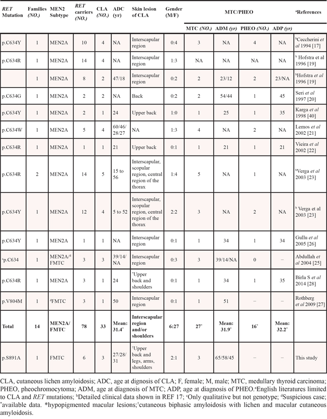 Table 2: Clinical data of patients with an association between the specific RET mutations and CLA in MEN 2