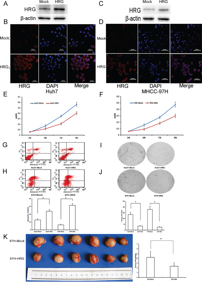 Overexpressed HRG inhibits cell proliferation, colony formation, and tumor growth, and promotes cell apoptosis in cultured Huh7 and MHCC-97H liver cancer cell lines