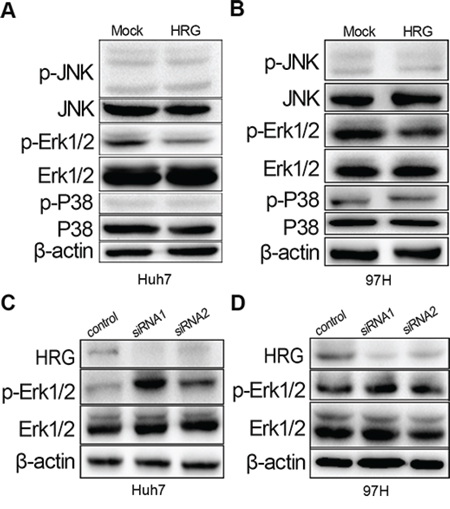 Figure 3: HRG could inhibit cell proliferation via the MAPK-Erk1/2 signaling pathway by reducing Erk1/2 phosphorylation. A, B. Overexpression of HRG in Huh7 and MHCC-97H could suppress Erk1/2 phosphorylation with no effect on JNK/P38 phosphorylation. C, D. Erk1/2 phosphorylation increased in HRG-depleted Huh7 and MHCC-97H cell lines.
