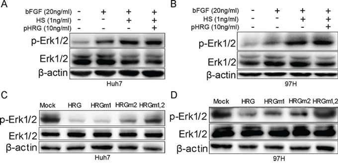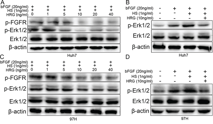 FGF first binds to HS and later to FGFR, thereby activating the FGF pathway [27]. Furthermore, HS is a ligand of HRG [11]. We added recombinant proteins bFGF, HS, and HRG to Huh7 and MHCC-97H cells. The result indicated that bFGF and the combination of bFGF and HS could stimulate Erk1/2 phosphorylation, while, most importantly, Erk1/2 phosphorylation returned to a comparatively lower level when HRG was also added (Fig. 4B and 4D). The decrease in Erk1/2 phosphorylation has a dose-dependent relation with HRG, and FGFR phosphorylation also has the similar tendency (Fig. 4A and 4C). These data indicated that HRG could competitively bind to HS and inhibit Erk1/2 phosphorylation via the FGF-Erk1/2 signaling pathway.
