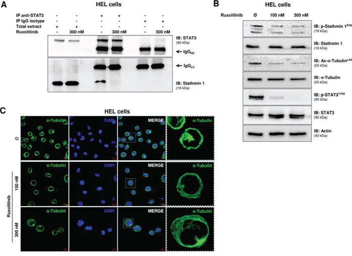 Figure 1: Ruxolitinib treatment induces microtubule instability. A. Immunoprecipitation (IP) with anti-STAT3 and immunobloting (IB) with anti-Stathmin 1 in total extracts from HEL cells, treated or not with ruxolitinib (300 nM). Isotype IgG antibody was used as a negative control of the immunoprecipitation; total cell extracts were used as positive controls for immunoblotting. B. Western blot analysis for Stathmin 1 serine 16 phosphorylation (an inhibitory site) (p-Stathmin 1S16) and alpha-tubulin acetylation (a marker of microtubule stability) (Ac-α-TubulinL40) levels in total cell extracts from HEL cells treated or not with different concentration of ruxolitinib (100 and 300 nM). The antibodies used for immunoblotting (IB) are indicated. The decreased p-Stathmin 1 and Ac-α-Tubulin levels indicate Stathmin 1 activation and microtubule instability upon ruxolitinib treatment. Immunoblotting for phospho STAT3 and total STAT3 confirmed the inhibitory effect of ruxolitinib on STAT3 activation; actin was used as a loading control. C. Confocal analysis of HEL cells, treated or not with different concentration of ruxolitinib (100 and 300 nM), displaying α-Tubulin (green) and DAPI (blue) staining; MERGE shows the overlapped images. Scale bars are shown in the figure (10 μm). Note more diffuse microtubule networks in ruxolutinib-treated cells.
