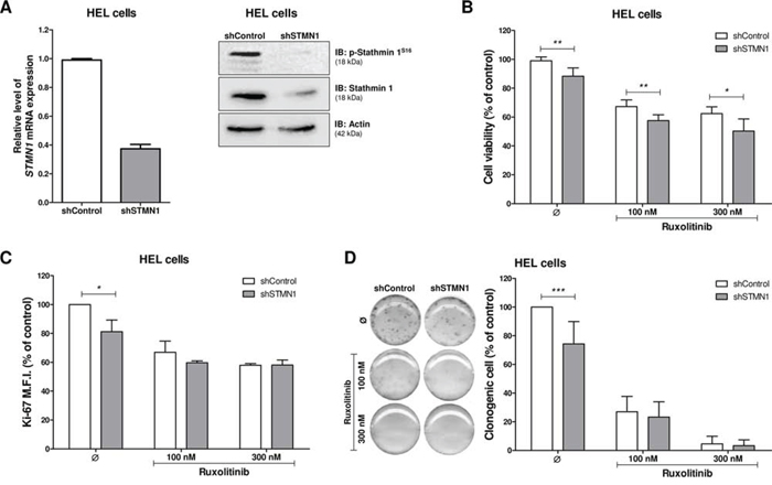 Figure 2: Stathmin 1 silencing reduces cell proliferation and clonogenicity. A. Stathmin 1 mRNA and protein expression in HEL cells transduced with lentivirus-mediated shRNA control (shControl) or Stathmin 1 (shSTMN1). The antibodies used for immunoblotting (IB) are indicated. B. Cell viability was determined by MTT assay after 48 hours of incubation of shSTMN1 and normalized by the corresponding shControl cells. Results are shown as mean ± SD of six independent experiments; *p < 0.05, **p < 0.01; Mann–Whitney test. C. Ki-67 mean of fluorescence intensity (M.F.I.) was determinated by flow cytrometry after incubation of shSTMN1 for 48 h and normalized by the correponding shControl cells. Results are shown as mean ± SD of four independent experiments; *p < 0.05, Student t test. D. Colonies containing viable cells were detected by MTT after 10 days of culture of shSTMN1 and normalized by the corresponding shControl cells. Colony images are representative of one experiment and the bar graphs show the mean ± SD of at least six independent experiments; ***p < 0.0001; Student t test. The assays were performed in the presence or not of ruxolitinib (100 and 300 nM) as indicated.