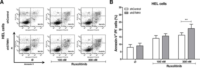 Figure 3: Stathmin 1 inhibition increases the pro-apoptotic effects of ruxolitinib treatment. A. Apoptosis was detected by flow cytometry in HEL cells transduced with shControl and shSTMN1 using Annexin-V/PI staining method and a representative dot plot is illustrated. B. Bar graphs show the mean ± SD of six independent experiments; **p < 0.01; Student t test. The assays were performed in the presence or not of ruxolitinib (100 and 300 nM) as indicated.