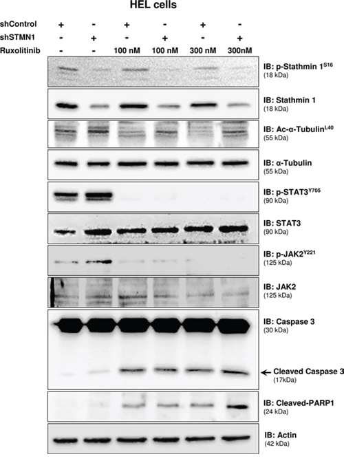Figure 4: Stathmin 1 silencing prevents microtubule instability induced by ruxolitinib treatment. Western blot analysis for p-Stathmin 1S16, Stathmin 1, alpha-tubulin acetylation (Ac-alpha-tubulinL40), p-STAT3Y705, p-JAK2Y221, caspase 3 (total and cleaved) and cleaved PARP1 levels in total cell extracts from shControl and shSTMN1 cells treated or not with ruxolitinib at 100 or 300 nM; membranes were reprobed with the antibody for detection of the respective total protein or actin, and developed with the ECL Western Blot Analysis System.