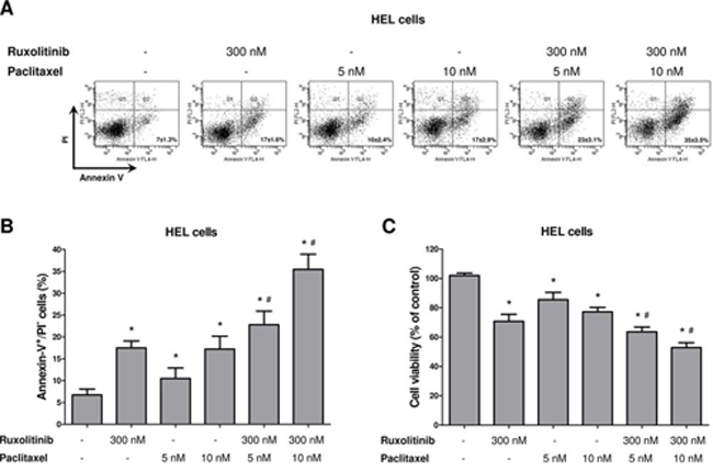 The HEL cell line, which is known to harbor the JAK2V617F mutation, was obtained from ATCC, Philadelphia, PA, USA. Cells were cultured in RPMI containing 10% fetal bovine serum (FBS) and glutamine with penicillin/streptomycin and amphotericin B, and maintained at 37°C, 5% CO2. Ruxolitinib, a selective JAK1/2 inhibitor, was obtained from Novartis Pharmaceuticals (Basel, Switzerland). Paclitaxel, a microtubule-stabilizing drug, was obtained from INTAS Pharmaceuticals (Ahmedabd, India).
