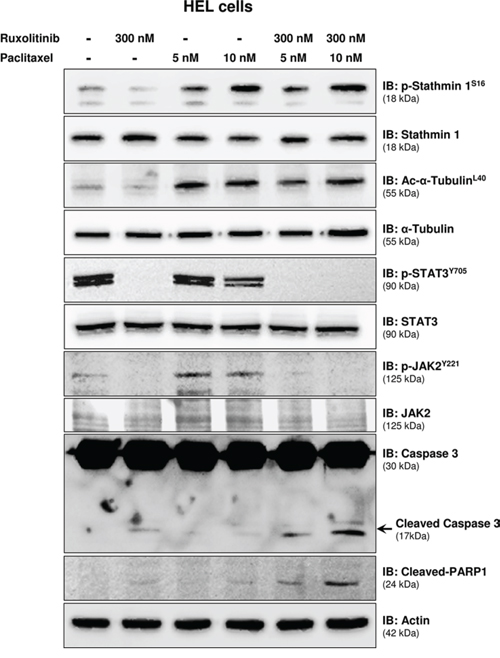 Figure 6: Paclitaxel treatment leads to Stathmin 1S16 phosphorylation and potentiates ruxolitinib-induced caspase 3/PARP1 cleavage. Western blot analysis for p-Stathmin 1S16, alpha-tubulin acetylation (Ac-alpha-acetylationL40), p-STAT3Y705, p-JAK2Y221, caspase 3 (total and cleaved) and cleaved PARP1 levels in total cell extracts from HEL cells treated, or not, with paclitaxel (5 or 10 nM) and/or ruxolitinib (300 nM); membranes were reprobed with the antibody for the detection of the respective total protein or actin, and developed with the ECL Western Blot analysis system.