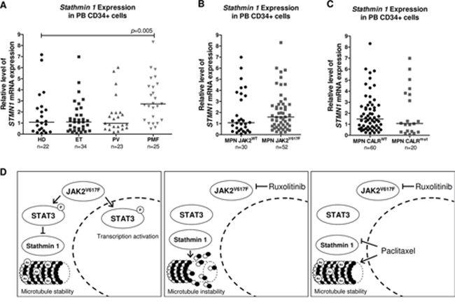 Figure 7: Stathmin 1 mRNA levels in CD34+ cells from healthy donors and patients with myeloproliferative neoplasms. A. qPCR analysis of Stathmin 1 (STMN1) mRNA expression in peripheral blood (PB) CD34+ cells from healthy donors (HD), and from patients with a diagnosis of essential thrombocythemia (ET), polycythemia vera (PV) and primary myelofibrosis (PMF), and from myeloproliferative neoplasms (MPN) patients stratified by B. JAK2V617F or C. CALR exon 9 mutational status. Horizontal lines indicate medians. The number of subjects and p values (Mann–Whitney test) are indicated in the graph. D. Potential model for Stathmin 1 function in HEL cells; the constitutive activation of JAK2 by the V617F mutation leads to STAT3 phosphorylation, Stathmin 1 inhibition and microtubule stability. Ruxolitinib treatment inhibits JAK2 and STAT3 activity, decreasing the Stathmin 1 and STAT3 association, which consequently releases Stathmin 1 and leads to microtubule instability. Paclitaxel treatment overcomes the effect of ruxolitinib treatment, inhibiting Stathmin 1 and increasing microtubule stability. Abbreviations: Ac: acetylation.