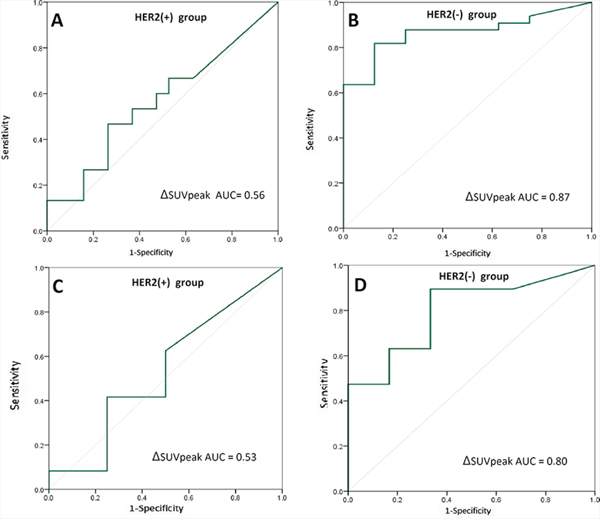 In our study, ΔSUV was shown to be a more valuable predictor for HER2-negative patients who underwent NAC alone (ROC-AUC = 0.80, P = 0.031), while the ROC-AUC of the ΔSUV decreased to 0.53 (P = 0.84) in HER2-positive patients who received NAC plus trastuzumab. Determining a cutoff value of ΔSUVpeak > 80% can predict 66% of pCR and 89% of non-pCR in HER2-negative patients. However, ΔSUVpeak did not accurately predict pCR in HER2-positive patients because a clear cutoff could not be established.