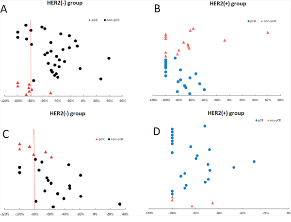 In the HER2-negative group, we predicted 75% of pCRs (6/8) and 88% of non-pCRs (29/33) by applying a cutoff value of ΔSUVpeak > 80%. However, in the HER2-positive group, the ΔSUVpeak could not predict pCR accurately because a clear cutoff could not be defined (Figure 2A, 2B).