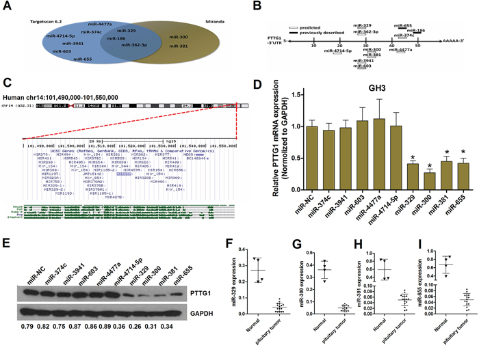 Figure 1: Identification of PTTG1-targeting miRNAs. A. Potential miRNAs predicted to down-regulate the expression of PTTG1 (Targetscan6.2 and Miranda). B. MicroRNAs that target PTTG1 3′UTR, both predicted and previously described. C. A screenshot (http://genome.ucsc.edu; GRCh37/hg19 assembly) of the region of interest at the chromosomal level (red horizontal bar, top image) and in detail (bottom image), showing the 51 miRNAs located within 10 kb of each other. D. Real-time PCR analysis indicated that PTTG1 expression was significantly decreased in GH3 cells transfected with miRNA mimics (hsa-miR-NC, hsa-miR-374c, hsa-miR-3941, hsa-miR-603, hsa-miR-4477a, hsa-miR-4714-5p, hsa-miR-329, hsa-miR-300, hsa-miR-381, hsa-miR-655) (*P < 0.05). E. Measurement of PTTG1 expression levels by western blot analysis. Protein was extracted from GH3 cells transfected with miRNA mimics. The endogenous expression levels of the GAPDH protein were used for normalization, and the relative PTTG1 protein expression levels are shown. F, G, H. and I. Real-time PCR analysis indicated that miR-329, miR-300, miR-381, and miR-655 expression was significantly decreased in pituitary tumors relative to normal controls.