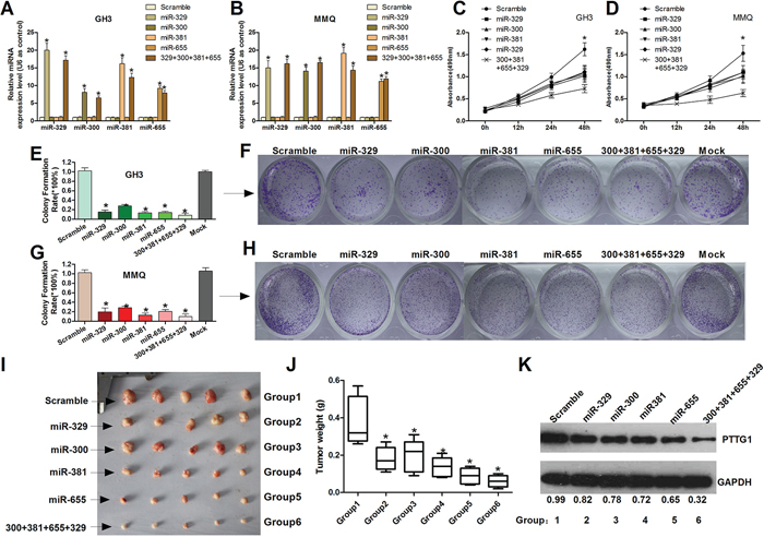 Figure 2: MiR-329, miR-300, miR-381 and miR-655 suppress cell proliferation activity and cell viability of GH3 and MMQ cells. A. and B. Measurement of miR-329, miR-300, miR-381 and miR-655 expression levels by real-time RT-PCR. U6 snRNA served as an endogenous normalizer of expression. The relative miRNA expression levels (mean ± SEM) are shown (*P < 0.05). C. and D. Cell viability was detected using the MTT assay. The relative cell growth activity was normalized to the growth activity of GH3 and MMQ cells in the control groups (*P < 0.05). E, F, G. and H. MiR-329, miR-300, miR-381 and miR-655 inhibit GH3 and MMQ colony formation. GH3 and MMQ cells transfected with miR-329, miR-300, miR-381, and miR-655 mimics or scrambled were seeded in 12-well plates. On the 14th day after seeding, the number of colonies was counted. The quantitative results are shown as the mean ± SEM. The experiments were repeated three times (*P < 0.05). I. and J. The GH3 pituitary tumor growth in vivo was determined based on the tumor weight after euthanasia. A representative image of an in vivo tumor in each group is shown. Group 1–6 is the group of mice injected with Scramble, miR-329, miR-300, miR-381, miR-655 or mixed miRNAs. Each group contained 5 nude mice. The error bars represent the SEM. (*P < 0.05). K. The tumors in each group were collected and combined, and then digested for western blot analysis to detect PTTG1 expression.