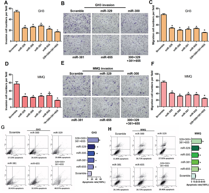 Figure 3: MiR-329, miR-300, miR-381 and miR-655 decrease cell motility in vitro and induce cell apoptosis of GH3 and MMQ cells. A–F. Transwell assays were used to evaluate the migration and invasion of GH3 (A, B and C) and MMQ (D, E and F) cells transfected with miR-329, miR-300, miR-381, miR-655, miR-329+miR-300+miR-381+miR-655 or scrambled. Representative fields of invasive cells on the membrane. The data were drawn from three independent experiments (*P < 0.05). G. and H. Apoptosis of GH3 and MMQ cells after transfection with miR-329, miR-300, miR-381, miR-655, miR-329+miR-300+miR-381+miR-655 or scrambled were determined by flow cytometry. The incidence of apoptotic cells is shown. The cells were stained with annexin V-fluorescein isothiocyanate and counterstained with 7-ADD (*P < 0.05).