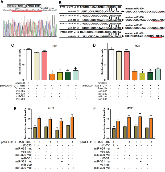 Figure 4: MiR-329, miR-300, miR-381 or miR-655 target PTTG1. A. The construction and sequencing map of PTTG1–3′UTR. B. The predicted miR-300, miR-381, miR-329 or miR-655 binding site on the PTTG1 mRNA 3′UTR and the mutation at the miRNA “seed region” binding site are shown. C, D, E. and F. GH3 and MMQ cells were transfected with the wild type version of the luciferase-PTTG1 3′-UTR reporter vector as well as the miR-300, miR-381, miR-329, or miR-655 mimics or scrambled. The miR-300, miR-381, miR-329, and miR-655 mimics reduced the intensity of the luciferase-PTTG1 3′-UTR reporter vector relative to the scrambled group, while the miR-300, miR-381, miR-329, and miR-655 mutants failed to alter the luciferase intensity. (*P < 0.05).
