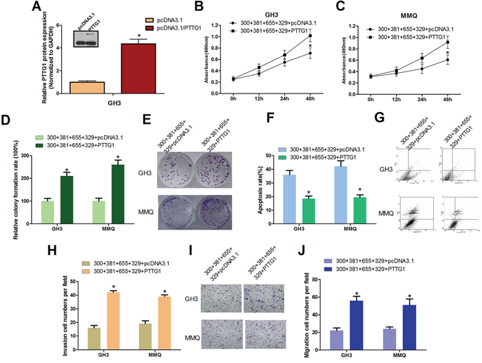 Figure 5: PTTG1 Overexpression Counteracts miR-329, miR-300, miR-381 and miR-655 induced pituitary tumor cell malignant inhibition. A. Transfection with pcDNA3.1/PTTG1 increased PTTG1 protein levels in GH3 cells compared with the control group (*P < 0.05). B. and C. GH3 and MMQ cells were transfected with plasmids expressing PTTG1 or control vector, together with miR-329, miR-300, miR-381 and miR-655. Cell viability was detected by the MTT assay (*P < 0.05). D. and E. PTTG1 overexpression reversed the cell growth suppression caused by miR-300, miR-381, miR-655 and miR-329 in the colony formation assay. GH3 cells and MMQ cells were transfected with pcDNA3.1/PTTG1(PTTG1) or pcDNA3.1 with miR-300, miR-381, miR-655 and miR-329, and then seeded in 12-well plates. The colony formation rate is shown (*P < 0.05). F. and G. In GH3 and MMQ cells, PTTG1 ectopic expression reduced the cell apoptosis caused by miR-300, miR-381, miR-655 and miR-329. The cells were stained with annexin V-fluorescein isothiocyanate and counterstained with 7-ADD (*P < 0.05). H–J. Cell migration and invasion were increased by ectopic expression of PTTG1 in GH3 and MMQ cells (*P < 0.05).