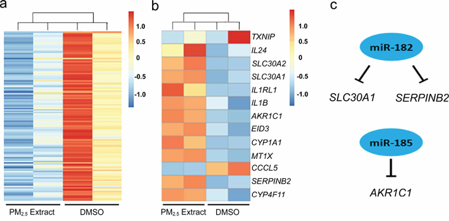 Under our experimental conditions and analytical criteria as described in Method, there were 13 genes aberrantly expressed (11 upregulated and 2 downregulated) in HBE cells exposed to dimethylsulfoxide (DMSO) extracts of PM2.5 compared with those in cells without exposure (Figure 1a). These genes are functionally involved in xenobiotic metabolism (e.g., CYP1A1, CYP4F11, AKR1C1, MT1X, TXNIP, SLC30A1 and SLC30A2), immunoregulatory or inflammatory response (e.g., IL24, IL1RL1, IL1B, CCL5 and SERPINB2) and other (EID3). Meanwhile, we identified 138 microRNAs aberrantly expressed in exposed cells compared with unexposed cells and all of these microRNAs were downregulated (Figure 1b). We then examined the correlation between the expression of microRNAs and mRNAs to predict the potential targets of microRNAs and found 3 genes, SLC30A1, SERPINB2 and AKR1C1, whose expression was inversely correlated with miR-182 and (or) miR-185 expression (Figure 1c). These results suggested that SLC30A1, SERPINB2 and AKR1C1 may be regulatory targets for miR-182 and miR-185. The upregulation of SLC30A1, SERPINB2 and AKR1C1 and downregulation of miR-182 and miR-185 in HBE cells exposed to PM2.5 extract detected by microarray were further confirmed by using quantitative real-time PCR (qRT-PCR) and Western blot assays (Supplementary Figure S1a and S1b).