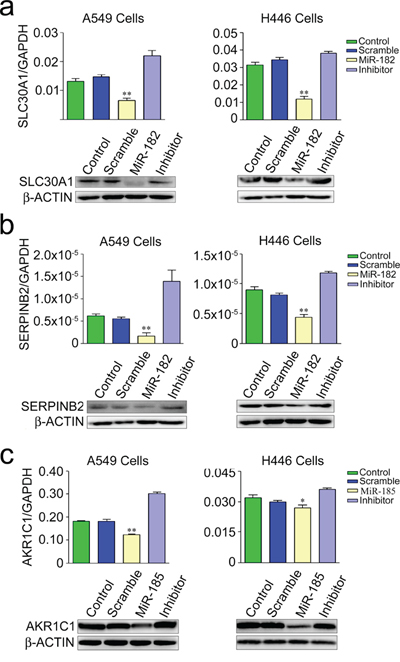 Figure 3: Suppression of endogenous mRNA (up panel) and protein (lower panel) of SLC30A1 a. SERPINB2 b. and AKR1C1 c. in A549 and H446 cells transfected with miR-182 mimic, miR-185 mimic or their inhibitor. Results of mRNA levels are mean ± SEM obtained from three experiments. *, P < 0.01 and **, P < 0.001 compared with control or inhibitor.
